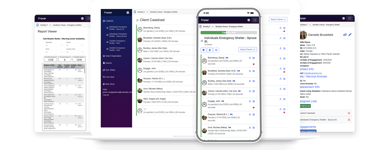 Developed in partnership with public service organizations, Engage combines mobile data entry with a centralized management platform. Field staff can log interactions, update client records, and create referrals directly from their device. When a connection is available, data automatically synchronizes through Warp Core, Nutmeg’s secure synchronization engine that maintains encryption, prevents duplicate entries, and ensures your HMIS remains accurate and current.