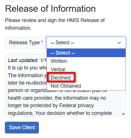 – Declined: Client has refused to sign a data sharing agreement